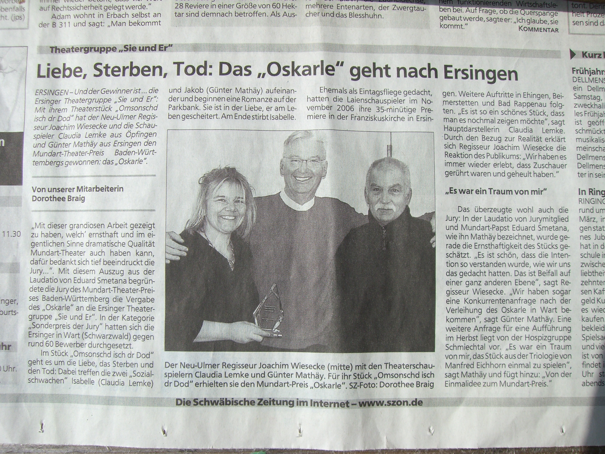 Mit dieser grandiosen Arbeit gezeigt zu haben, welch ernsthaft und im eigentlichen Sinne dramatische Qualität Mundart-Theater auch haben kann, dafür bedankt sich tief beeindruckt die Jury beim Autor Manfred Eichhorn, beim Regisseur Joachim Wiesecke und den beiden Protagonisten Claudia Lemke und Günter Mathäy, indem sie ihnen einen Sondereis Oskarle 2009 verleiht.